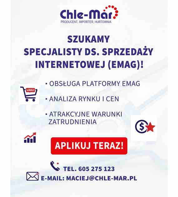Hurtownia artykułów metalowych i narzędzi CHLE-MAR poszukuje osoby do obsługi sprzedaży na platformie eMAG. Jeśli znasz rynek e-commerce i potrafisz analizować ceny – czekamy na Ciebie!